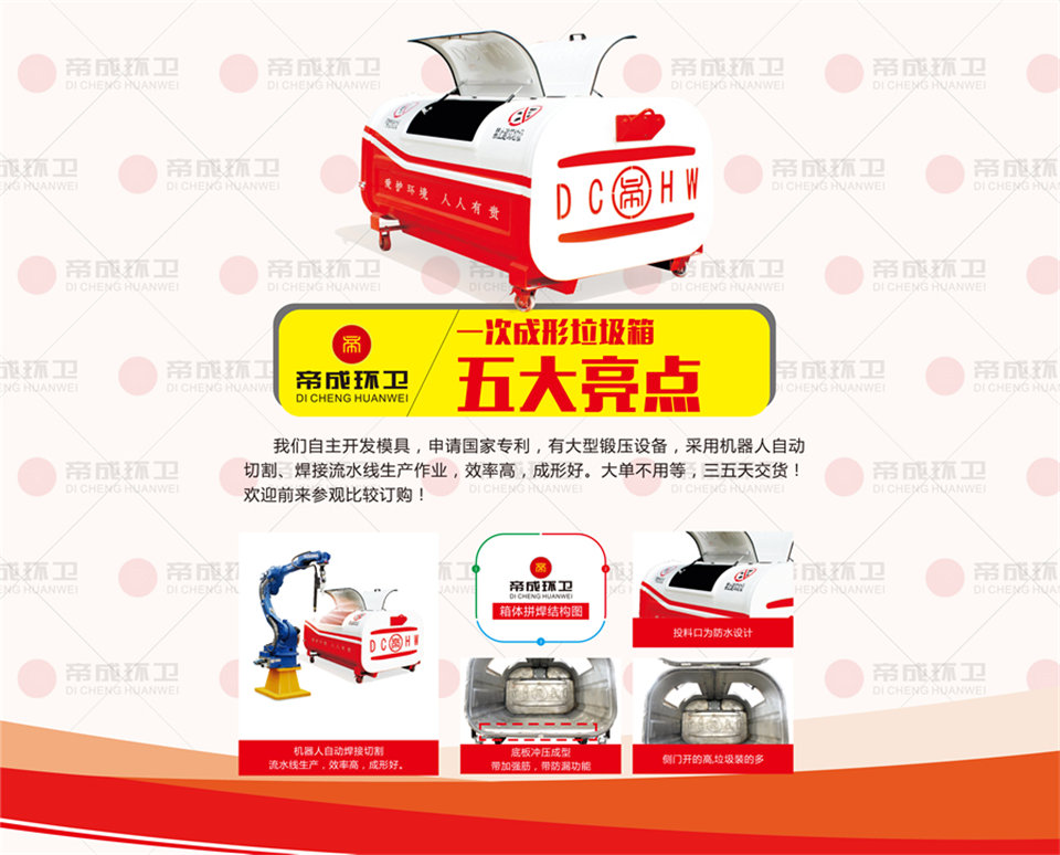 1.一次成型垃圾箱是我公司自主開發(fā)模具,申請**,我們有大型鍛壓設(shè)備,采用機器人自動切割,焊接流水線生產(chǎn)作業(yè), 效率高,成型好。
