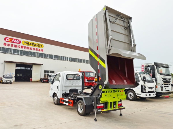 自裝卸式垃圾車在底盤的基礎(chǔ)上,加裝垃圾箱體、連接附件、防護(hù)欄及液壓系統(tǒng)等裝置。具有操作安全、使用性能穩(wěn)定、返修率低、售后服務(wù)及時(shí)周到等特點(diǎn)。本產(chǎn)品主要用于收集與轉(zhuǎn)運(yùn)城市住宅小區(qū)、鄉(xiāng)鎮(zhèn)街道等產(chǎn)生的生活垃圾。整車小巧靈活,行動(dòng)方便,適應(yīng)人流密集的商業(yè)區(qū)域和道路交通情況較差的城鄉(xiāng)地區(qū)。本車配有后掛桶進(jìn)料機(jī)構(gòu),在翻桶處操作,可與120L/240L/660L標(biāo)準(zhǔn)塑料桶對(duì)接。整車具有自卸功能,卸料方便。結(jié)構(gòu)結(jié)實(shí)耐腐 船型箱體結(jié)構(gòu)實(shí)現(xiàn)100%無(wú)泄漏;刮板進(jìn)料+壓縮 壓縮效率高;高位舉升自卸結(jié)構(gòu),卸料干凈 對(duì)接方便;多功能翻桶進(jìn)料機(jī)構(gòu) 進(jìn)料快捷穩(wěn)定;液壓系統(tǒng)穩(wěn)定可靠;自動(dòng)化程度高,電液聯(lián)合控制。