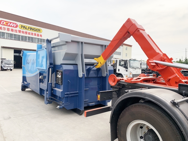 車廂可卸載式垃圾車,又稱勾臂式垃圾車、拉臂式垃圾車。該車廣泛適用與城市街道學(xué)校垃圾處理,可一車配備多個(gè)斗,各個(gè)垃圾點(diǎn)放置多個(gè),帶自卸功能,液壓操作,方便傾倒。在平日里可將車載垃圾箱放置到各個(gè)垃圾收集站,待垃圾收集滿后,該車可直接開赴至垃圾站,通過液壓系統(tǒng)的操控,可將垃圾車后座上加裝的勾臂放下,掛住站內(nèi)垃圾箱前端的連接點(diǎn),將垃圾箱拉至車體的后座上,此時(shí)即可啟動(dòng)車輛,將垃圾運(yùn)送至垃圾處理站內(nèi),進(jìn)行自卸式傾倒。該車主要的優(yōu)點(diǎn)就是可一車配多斗,一輛車就可以維持?jǐn)?shù)個(gè)垃圾收集站的運(yùn)轉(zhuǎn),效率高,且箱體為密封式設(shè)計(jì),不會(huì)造成二次污染。